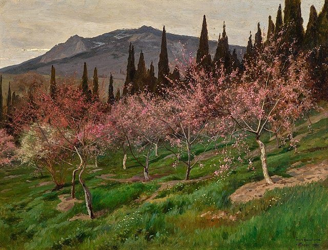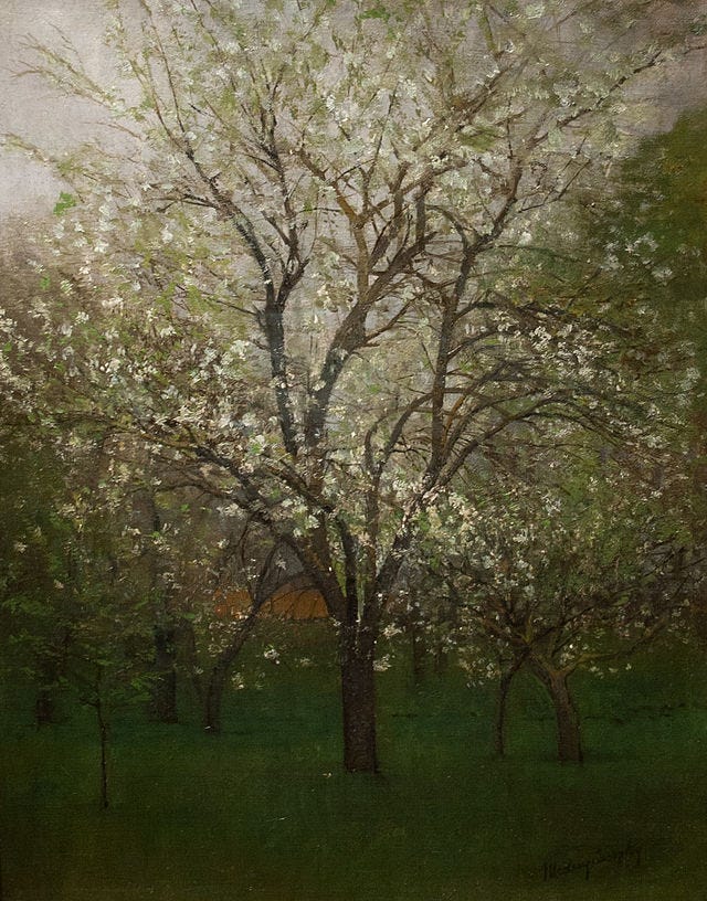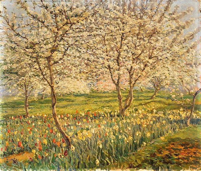 I’d like to take you out for a day of blossoms. Now, in this moment. Before the rush of a week ending is upon us. We’re going to start at dawn in 1926, and then through the sunshine hours. You’ll see the shift into late afternoon and finally the fall of evening, an 1891 moon hanging like a pearl, as it should in Spring.